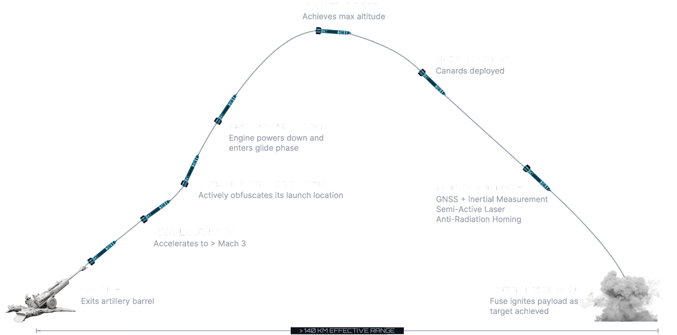 Traditional 155mm munitions have limited targeting capabilities (CEP > 100 meters) and a maximum range of 24 km. Several more modern 155mm shells, such as the M982 Excalibur and legacy shells retrofitted with guidance modules, have improved the targeting capabilities with GPS and laser guided options, but with ranges of no more than 40 km. Finally, most long-range projectiles require solid propellants that have a high cost to develop, limited manufacturing bases, and are an explosive hazard.